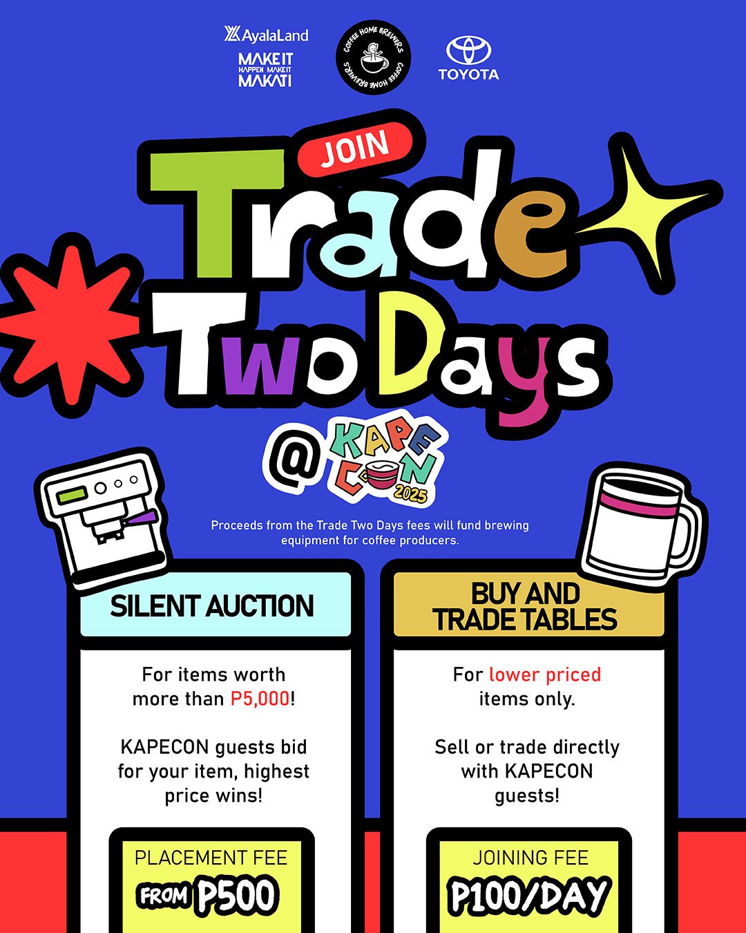 Trade Two Days is the official marketplace and swap meet of Kapecon 2025, designed to give Coffee Home Brewers (CHB) members the opportunity to sell or auction their coffee-related equipment and accessories.