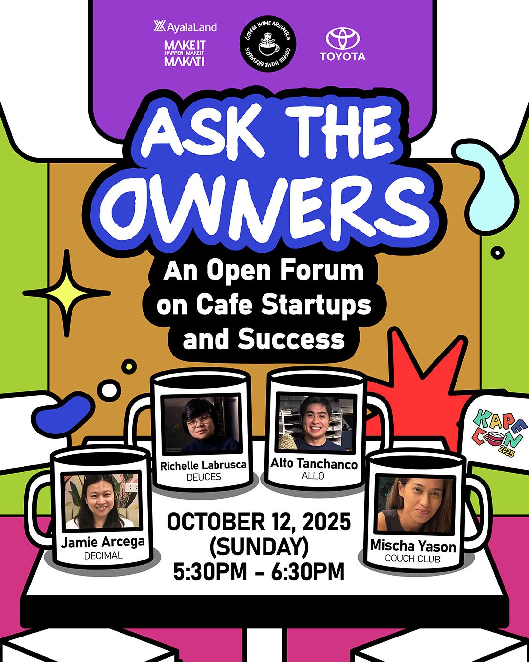 5:30 PM - 6:30 PM | ESPRESSO ASK THE OWNERS: An Open Forum on Cafe Startups and Success FEATURING: Jamie Arcega, Decimal Richelle Labrusca, Deuces Alto Tanchanco, Allo Mischa Yason, Couch Club |